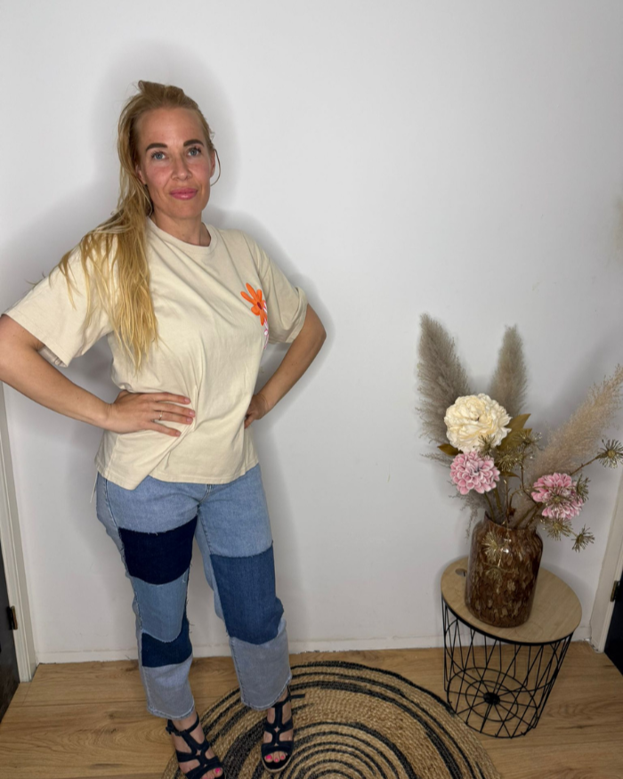 Licht, zacht en met een vrolijke twist – het Sunkissed Bloom t-shirt is jouw nieuwe favoriet voor zonnige dagen. De warme beige tint straalt rust uit, terwijl de oranje bloemprint een speels accent geeft.